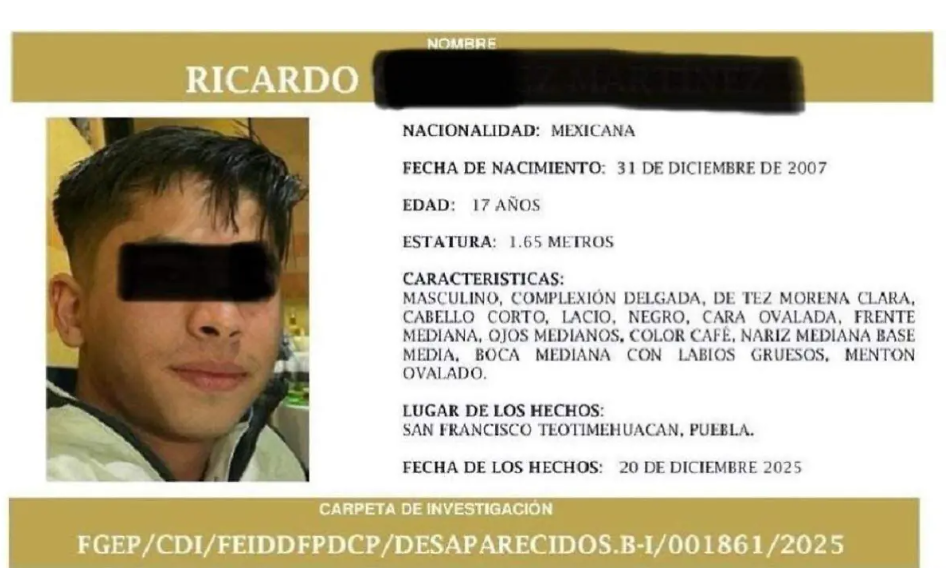 El joven, identificado como Ricardo N., fue visto por última vez el 20 de diciembre, cuando salió de su trabajo en una pizzería. Tras su desaparición, familiares iniciaron su búsqueda y se emitió una ficha por parte de la Fiscalía General del Estado.