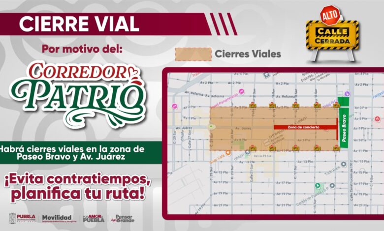 El primer cuadro de la ciudad permanecerá cerrado en las siguientes intersecciones: 11 Poniente y 15 Sur; 11 Poniente y 25 Sur; 3 Poniente y 25 Sur; y 3 Poniente y 15 Sur. Como rutas alternas se sugieren: en sentido poniente-oriente, 23 Poniente, Bulevar Atlixco y 4 Poniente; en sentido oriente-poniente, 4 Poniente, Bulevar Atlixco y 25 Poniente; y adicionalmente, 15 Poniente, 23 Sur y 25 Sur.