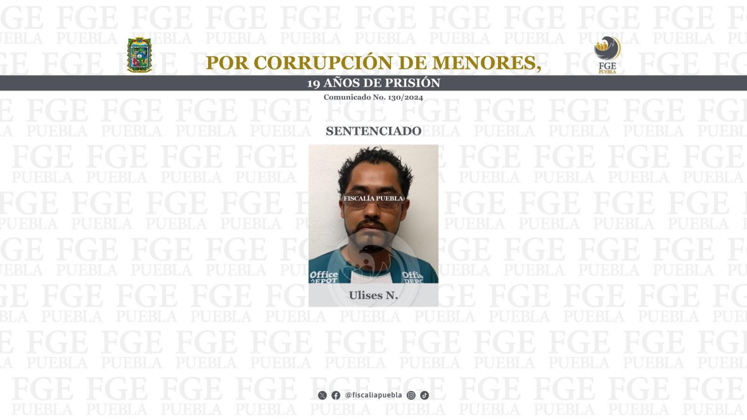 La Fiscalía General del Estado de Puebla logró obtener sentencia condenatoria contra Ulises N. quien fue hallado penalmente responsable del delito de corrupción de menores.