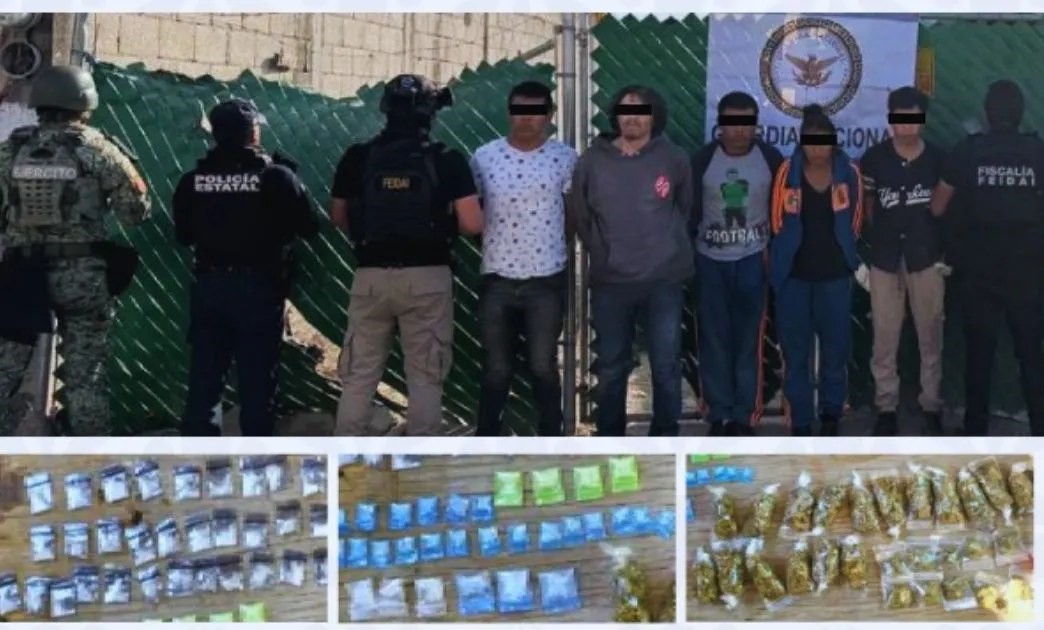 Durante la diligencia fueron detenidos Juan N., Juan José N., José N., Daniel N., Miguel N. y Guadalupe N. Además, las autoridades aseguraron 61 envoltorios con sustancia granulada con características similares al cristal, 29 envoltorios con hierba verde con características de marihuana y dinero en efectivo.