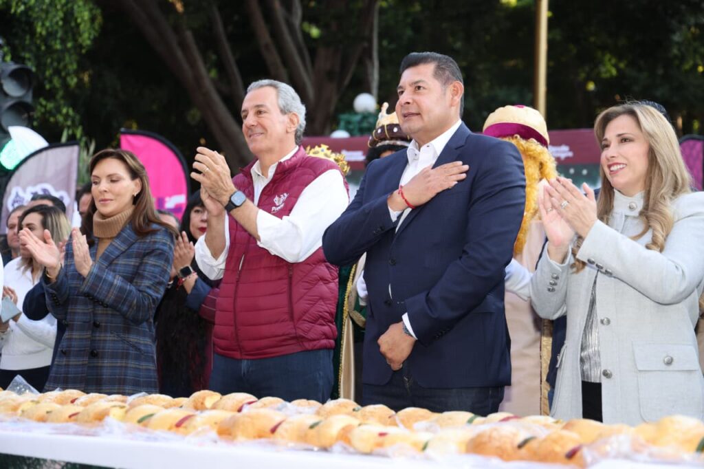 El gobernador Alejandro Armenta, acompañado de Ceci Arellano, presidenta del Patronato del Sistema Estatal DIF, convivió con miles de familias poblanas durante la partida de la rosca, junto al presidente municipal, Pepe Chedraui, y su esposa, MariElise Budib.