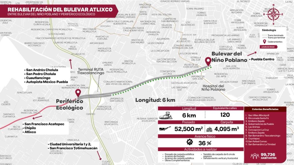 Los beneficios alcanzan a colonias y comunidades como Emiliano Zapata, Concepción la Cruz, Geovillas, Rinconada Santa Fe, Tlaxcalancingo, San Rafael Comac, San Bernardino Tlaxcalancingo y San Antonio Cacalotepec, además de fortalecer la conexión hacia Chipilo, Atlixco y zonas metropolitanas, mediante procesos técnicos de alta precisión y durabilidad.